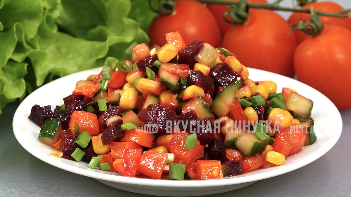 Сегодня поделюсь рецептом очень вкусного, яркого и легкого овощного салатика, который поможет разнообразить постное меню. Запеченные плюс свежие овощи и сладкая консервированная кукуруза. Такой салат и на праздничном столе найдет свое место. Очень интересный вкус придают салату запеченные овощи - морковь и свекла. Запекаю их не целиком - так удобнее. Нарезаю сырые овощи на небольшие кубики. Сначала морковь. Выкладываю в форму для запекания, добавляю немного масла и перемешиваю. Со свеклой делаю все тоже самое. Ставлю овощи в разогретую до 180°С духовку. Через 15 минут достаю из духовки морковь. Она готова. А свеклу оставляю запекаться еще 15 минут. Пока морковь и свекла остывают, нарезаю свежий огурец также на небольшие кубики. И помидоры 🍅.