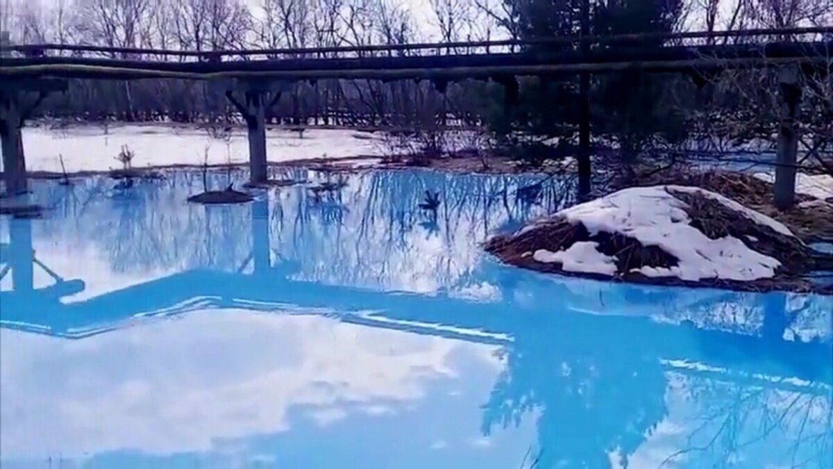 В Дзержинске (Нижегородская область) появилось необычное озеро, имеющее яркий голубой цвет. Необычными красками вода заиграла, судя по всему, после сброса в него химических отходов.