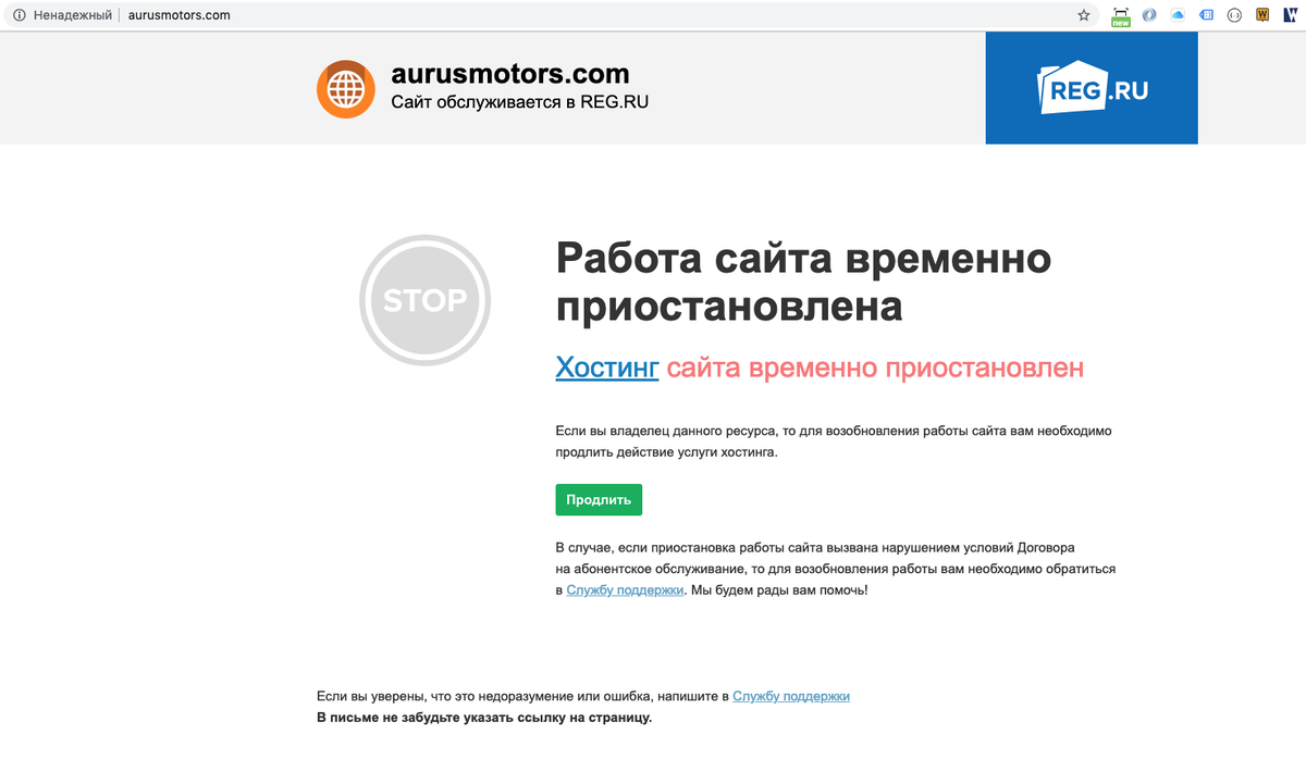 Единственный российский премиальный автопроизводитель остался без официального сайта — страница Aurus по адресу http://aurusmotors.com/ просто не загружается. На главной странице вместо описания российского бренда, его моделей и прочих официальных сведений висит заглушка от хостера Reg.ru, сообщающая о том, что «Работа сайта временно приостановлена». Причины, по которым хостинг сайта временно приостановлен, не уточнены. Aurus является производителем премиальных моделей, в линейке которых седан Senat S600, лимузин Senat L700 и минивэн Aurus Arsenal. Стоимость автомобилей составляет несколько десятков миллионов рублей, а первыми их получили первые лица государства — президент России и премьер-министр. Поставьте, пожалуйста, лайк - для вас не сложно, а нам это очень важно.