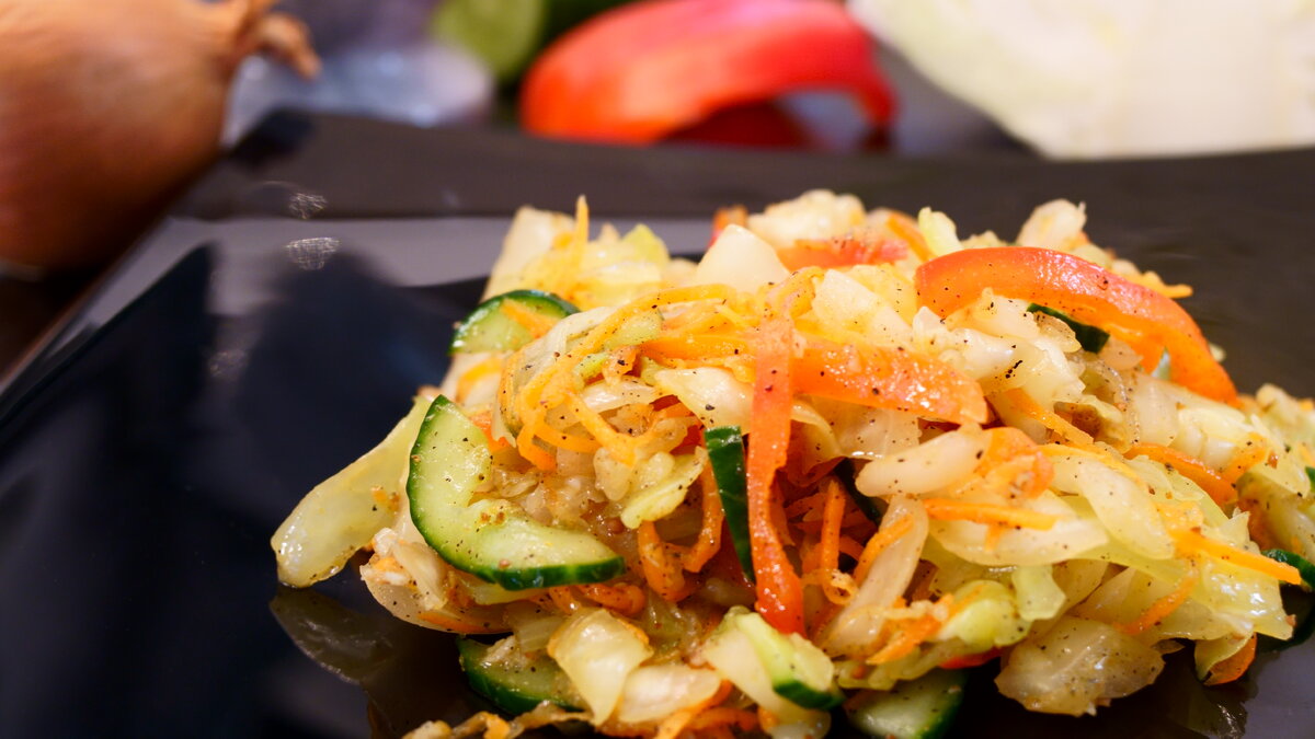 Соль по вкусу Подробное описание рецепта Нарезаем капусту, натираем морковь на специальной тёрке или на обычной крупной терке, располагая бочек моркови почти параллельно поверхности терке. Хорошо перемешиваем, оставляем минут на 20, пока капуста не выделит сок. По истечению времени капусту с морковью отжимаем и перекладываем в другую емкость. Нарезаем огурец и болгарский перец, отправляем в салатницу с капустой и морковкой, солим по вкусу. Перемешиваем ещё раз. Нарезаем лук полукольцами и обжариваем его в растительном масле на хорошо разогретой ск