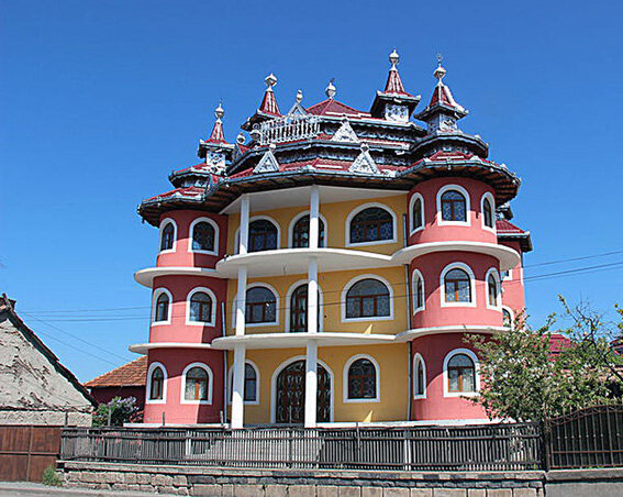 Хуеди́н — город на северо-западной оконечности исторического региона Трансильвания в Румынии. До 1848 года принадлежал венгерскому роду Банфи и назывался Банфи-Хуньяд. Мне он показался интересен не только названием, но и необычной архитектурой. Я впервые в жизни столкнулся с такими нелепостями в зодчестве: я слышал, как Антонио Гауди в сторонке плакал навзрыд. Предлагаю вашему вниманию несколько фото, которые я нащёлкал прямо из авто. Дома с многоярусными крышами напоминают дворцы, созданные безумным архитектором, начисто лишённым какого-либо художественного вкуса. Это памятники кичу, причём, слепленные, зачастую, из того, что было. Архитектура Хуедина – это парад понтов друг перед другом, потому что жить в таких дворцах крайне неудобно, особенно на верхних ярусах, где располагаются по несколько(!) крыш. Как выяснилось, владельцы этих нелепых домов – цыгане, и они в этих