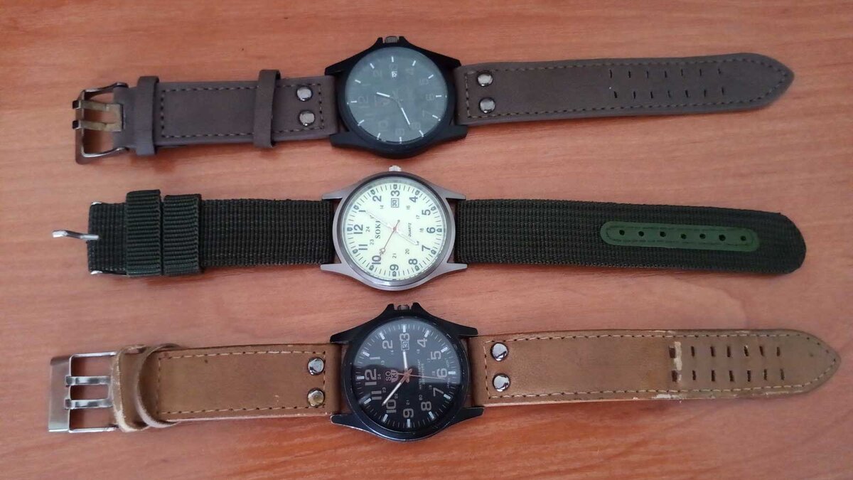 За последние пару лет у меня появилось уже трое мужских часов SOKI. Двое часов повседневных на ремне из ПУ кожи и одни, в моем понимании, для активного отдыха. У них светонакопительный циферблат и матерчатый ремень. Все часы имеют кварцевый механизм, работают от батарейки и не требуют заводки. Часы с ремнем из ПУ кожи фиксируются на 2 отверстия, имеют декоративную строчку, а также заклепки. Цвет циферблата черный, а цифры сделаны в цвет ремня. Одни часы были куплены в темно-коричневом цвете, а вторые в горчичном. Также в продаже есть часы с черным и зеленым ремнями. У них уже циферблат белого цвета, а цифры выполнены в цвет ремня. Посмотреть их можно по этой ссылке. Вторые часы SOKI немного отличаются дизайном циферблата и ремешком – он тканевый. Материал довольно плотный, но дискомфорта при носке не создавал. Здесь также имеется несколько цветовых решений, я для себя выбрал часы темно-зеленого цвета. Остальные модели можете посмотреть по этой ссылке. Главное отличие этих часов SOKI –