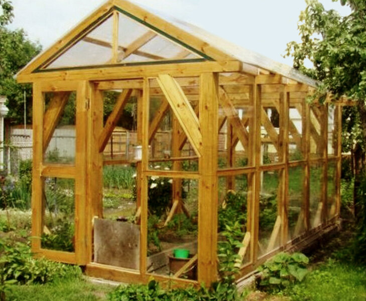 Взамен заводским конструкциям дачники решают самостоятельно построить деревянную теплицу. Это лишний повод восхищаться собой и сэкономить семейный бюджет. Самодельная теплица не займет много времени на постройку и позволит воплотить в жизнь собственный проект. Конструкция Каркасную теплицу сооружают из брусьев, с одной стороны которой вставляют дверную раму. Каркас обтягивают полиэтиленовой пленкой, покрывают стеклом или поликарбонатом. Прозрачные и прочные материалы покрытия обеспечивают: Подбираем материалы Для постройки классической застекленной теплицы закажите: Порядок действий Это лишь один из примеров двускатной остекленной теплицы, которая не занимает много времени на постройку.