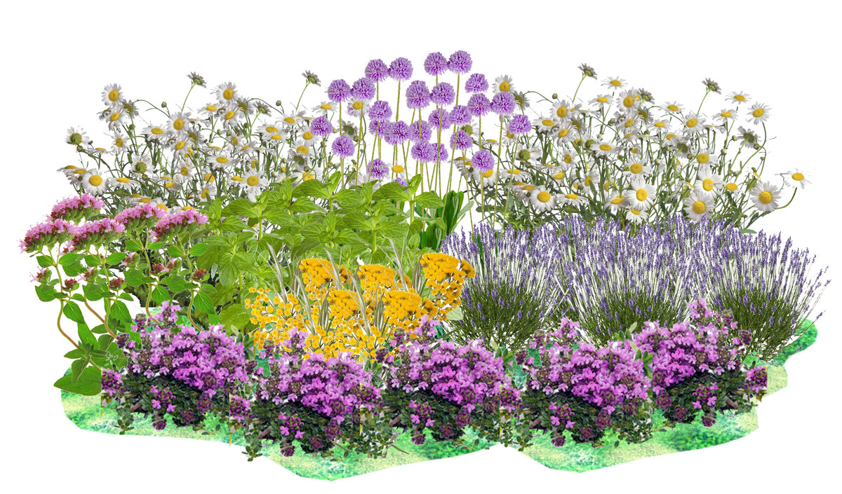 Добрый день! Кто не любит летом после бани попить чай с ароматными травами... Специально для таких любителей подготовила схему клумбы с пряными травами. Такая клумба порадует хорошим урожаем и своей красотой. Эта композиция в сиренево-желтых тонах. Предназначена для открытых солнечных мест. Размер клумбы 3 метра в длину и 2 метра в ширину. Итак, приступаем к разбору схемы: 1. Шнитт-лук сибирский Это многолетнее травянистое растение, требует минимального ухода. Очень декоративное за счет цветения сиреневыми соцветиями в виде шаров, которые зацветают в мае. Высота в период цветения может достигать 60 см. Листья шнитт-лука используются в пищу, обладают повышенным содержанием витаминов. 2. Ромашка аптечная Есть другое название - ромашка лекарственная. Однолетнее растение высотой до 40 до 60 см. Цветет все лето, с мая по сентябрь. В медицинских целях применяются только соцветия ромашки. 3. Душица Или орегано еще называют. Многолетник, высотой до 50-70 см. Очень быстро разрастается, получае