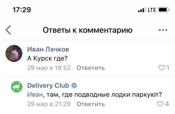 На вопрос одного из пользователей «ВКонтакте» об акции компании в Курске, представитель компании ответил: «там, где подводные лодки паркуют». Шутка вызвала широкий резонанс в соцсетях, подписчики обвинили компанию в неуважительном отношении к погибшим морякам. В пресс-службе Delivery Club сообщили радиостанции «Говорит Москва, что комментарий в соцсети оставил стажёр, которому «не хватило знаний географии». «Комментарий оставил стажёр нашего SMM отдела. Он не хотел никого обидеть, не имел злого умысла и не вкладывал в сообщение никакого подтекста. Ему не хватило знаний географии для адекватной оценки своей идеи. Безусловно, мы считаем такие действия недопустимыми, поэтому удалили комментарий, отстранили сотрудника от работы и принесли извинения автору вопроса. И ещё раз извиняемся перед всеми за эту ситуацию». Российский атомный подводный ракетный крейсер «Курск» затонул в Баренцевом море в результате катастрофы, произошедшей 12 августа 2000 года. Все 118 членов