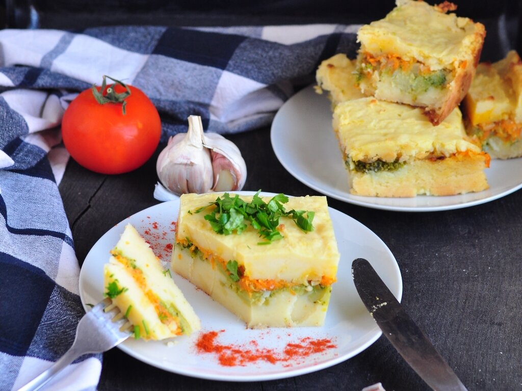 Картофельная запеканка с брокколи - еще одно блюдо для постящихся. Легкое и овощное блюдо для всей семьи. Ингредиенты Шаги приготовления: 1. Картофель очистите, отварите в подсоленной воде и сделайте пюре, добавив растительное масло. Если пюре очень рассыпчатое - добавьте 15 г крахмала. 2. Брокколи отварите 3 минуты в подсоленной воде. Откиньте на дуршлаг. 3. Морковь очистите и натрите на крупную тёрку, лук и чеснок порежьте кубиками. Обжарьте на растительном масле до мягкости. Добавьте соль, перец и любимые специи. Смешайте с 15 г крахмала.