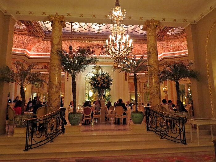 Главным пунктом одних летних выходных стала церемония чаепития в лондонском отеле Ритц. Года 4 назад где-то в интернете попалась статья с фотографиями и подумалось "а почему бы и нет?". Вот наконец и это реализовалось. Заказывали столик заранее (за месяц, кажется). Стоимость услуги — 50 фунтов с человека (чай с выпечкой) или 70 фунтов (плюс шампанское). Взяли обычный чай, рассудив, что если уж захочется шампанского, за этим дело не станет ) Итак, в пятницу, встретив подругу, прилетевшую из Ирландии, и прокатившись на колесе обозрения, мы понеслись в отель — переодеваться. Ибо никто не пустит вас в Ритц в джинсах. Стиль одежды — smart casual. Справедливо рассудив, что негоже на такое мероприятие ехать на метро, мы, как приличные люди, вызвали такси прямо из номера отеля. И вот мы у отеля. Швейцар открывает дверь такси, подает руку. У дверей нас встретил портье, указал нам направление гардероба. Там нас перехватил другой и подвел к залу ресторана Palm Court, передав, что называется, с