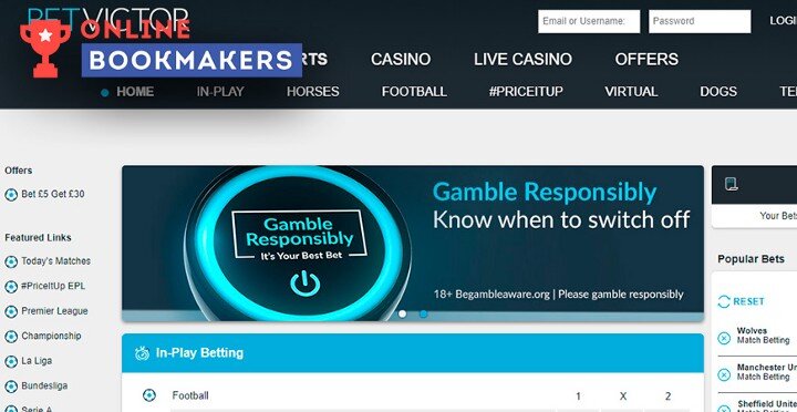 Главная беттинг площадка BetVictor имеет современный дизайн, безупречный интерфейс и продуманное меню разделов. Из главного меню пользователь может перейти в разделы спортивных событий, казино, Live казино и бонусных предложений. Беттеру сразу предлагаются наиболее посещаемые разделы сайта — Live, футбол, лошадиные скачки, собачьи бега, теннис и виртуальные игры. В предматчевой линии виды спорта сгруппированы по степени популярности и в алфавитном порядке. На главной странице сайта содержится информация о текущих лайв событиях, популярных ставках и предстоящих матчах.