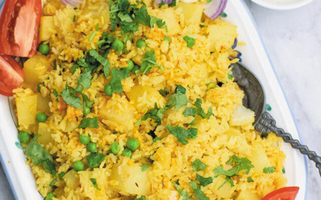 Добавьте эту смесь в рис и картофель и перемешайте. Накрыть крышкой и варить на максимум в течение 1-1,5 часов. Вы заметите, что рис поглотил бы всю воду и больше не будет слипшимся. Добавьте зеленый горошек и накройте крышкой и дайте мультиварке оставаться в тепле 30 минут.