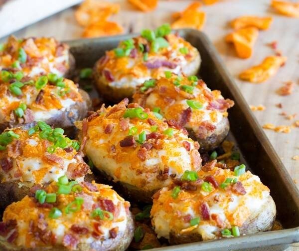 Картофель запеченный в духовке рецепт довольно простой и в тоже время вкусный и необычный. Ведь Вы наверняка еще не использовали в подобном блюде чипсы. Для приготовления такого блюда обязательно покупайте картофель с низким содержания крахмала, сорт уточняйте у продавца. Скажите что Вам нужен картофель который не разваривается и держит форму после запекания. Иначе у Вас не получится из готового картофеля сделать лодочки, он просто развалится. Также не стоит использовать сильно старый картофель и испорченный. Учитывая все эти простые советы у Вас получится приготовить вкусный запеченный картофель в духовке. Ингредиенты: Готовим дома картошку в духовке: Разогрейте духовку до 200 градусов, выложите целую, не очищенную но очень хорошо вымытую и сухую картошку в глубокий противень и смажьте каждую картофелину оливковым маслом и посыпайте солью. Запекайте приблизительно 1 час или до тех пор, пока она не станет хрустящей снаружи и мягкой внутри. Затем выньте с духовке противень с картоф
