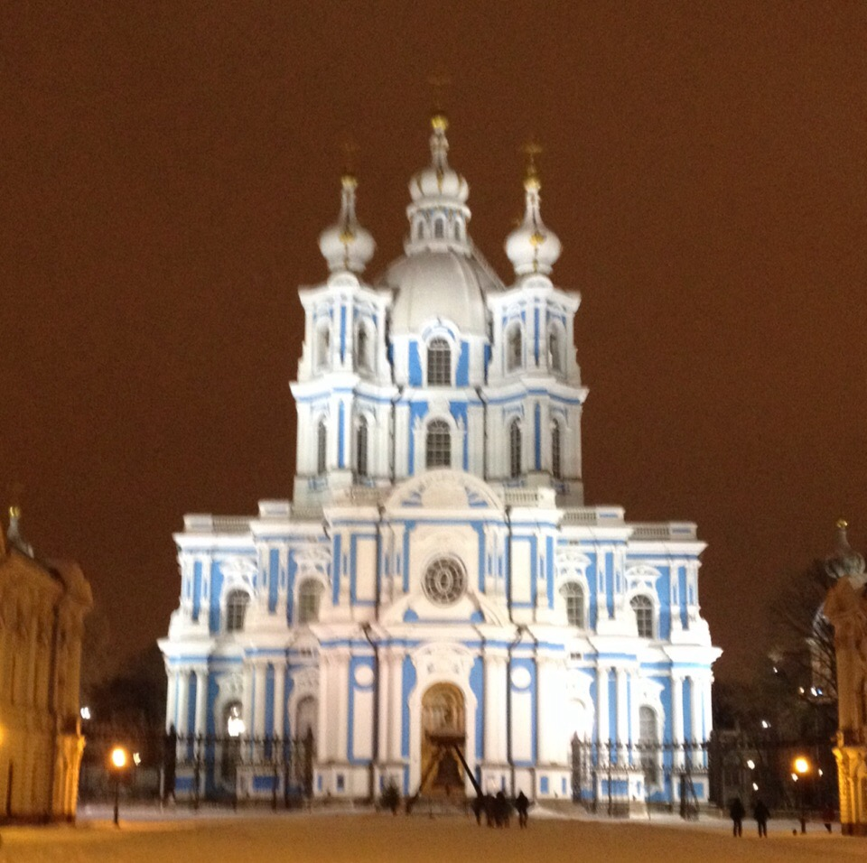 Захожу на кухню, боже, стол сервирован, и чего только на нем нет, ну а вдруг девочкам это захочется... Даже не знаю, как на это реагировать, умиление, благодарность и радость, что моей подруге так повезло, ну и мне до кучи. Все так приятно и мило, я точно в раю. После завтрака мне показывают на карте весь наш маршрут, даже с озвучкой в километрах, какая забота. Мы дружно выпадаем из подъезда, к стати, у них он называется "лестница", причем не в разговорной речи, а прямо официальная табличка "лестница №3", к примеру, чудно... Автобус нас везет до метро, у них нет кондукторов, платят при входе в автобус, шоферу. Сколько новых эмоций, погода уже совершенно иная, метет, снег не очень густой, но и не редкий. Выйдя из метро первое, что попадается на глаза, это памятник конке, если кто то не знает, вагончики когда то возили лошади. Я просто иду, куда ведут, только успевая щелкать телефоном, и поскольку шел снег все окружающее получалось как будто в мареве. Красиво, монохромный, будто в заоблачной дали пейзажи небесных городов. Набережная, это конечно красивейшее место, не даром всю красоту строили именно на ней, фасад города. Затем мы вышли на Невский, посмотрели его в огнях, попутно меня запечатлели рядом с Остапом Бендером. Храм Спаса на крови был великолепен во всех ракурсах, мы с Яном , как фоторепортеры вокруг модели, кружились вокруг него запечатлевая все его ракурсы застывшей красоты и величия . На площади перед зимним всех развлекал дяденька играя на гитаре и исполняя песни прошлых лет, мы немного потусовались и продолжили свой путь.И вот когда уже казалось, что наш экскурсионный день подошел к завершению и нам осталось только подкрепиться перед дорогой домой, мы встретили женщин, которые приглашали на экскурсию по праздничному Питеру в огнях. Натали тут же отреагировала,-" Едем!" Мы с Яном сделали слабую попытку, а типа поесть. "Ничего,- ответила Наталья,-У нас в запасе час , успеем!" Добрая женщина подсказала, что не далеко есть не очень дорогая столовая в которой вкусно кормят. Мы устремились туда, пока нам разрешалось перекусить. Столовая оказалась вполне себе приличным заведением, и поскольку там работали конечно же женщины, дискриминация была на лицо. Ян был передо мной, и девушка на раздаче, широко улыбаясь положила ему поджарки столько, что я купилась и тоже попросила поджарку. Меня одарили половиной порции Яна, я молча проглотила эту несправедливость. Это конечно шутка, в смысле, что я сильно обиделась, я же помню кто нам готовил завтрак, заслужил, и это было одобрение высших сил. А я чем заслужила двойную порцию, да ни чем, вот и не возникай, и вообще тебе надо поменьше "жрать". Плотно поев мы сразу ощутили прилив сил и настроения и поспешили к месту посадки в экскурсионный автобус. Когда народ собрался мы двинулись обозревать ночные красоты Санкт-Петербурга. Я запечатлелась у грифона, подержалась за его клык и загадала желание глядя в глаза сфинкса. Левик тоже не отказал мне в совместной фотографии, красавица "Аврора" порадовала наш глаз. Самое сильное впечатление на меня произвел институт благородных девиц, то бишь смольный и его пристройки, что как безешные пироженки возбуждали аппетит и фантазию, все напоминало изящный, продуманный и воздушный торт, в общем весь комплекс просто восторг! Экскурсия впечатлила меня до слез, сама не знаю почему. Домой