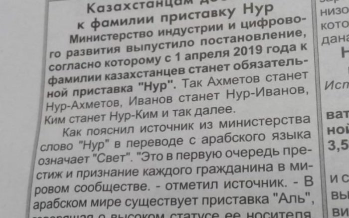 Новость о приставке «Нур» в фамилиях жителей республики оказалась ложной.Представитель пресс-службы Министерства информации и общественного развития Казахстана Айжан Мусинова 28 марта 2019 года выступила с опровержением сведений о принудительной смене фамилий жителей республики. По ее словам, граждан не заставят добавлять приставку «Нур» к своим фамилиям, пишет TengriNews.Ранее в социальных сетях по Казахстану начали распространяться сведения о том, что якобы министерство индустрии и цифрового развития выпустило постановление, согласно которому все граждане республики обязаны с 1 апреля поменять свои фамилии, добавив к ним приставку «Нур». Эти сведения заставили казахстанцев встревожиться, так как ранее власти республики утвердили переименование столицы из Астаны в Нур-Султан.Мусинова рассказала, что понять недостоверность этой новости можно было сразу по нескольким признакам. Прежде всего, ведомства, указанного в заметке, в Казахстане не существует.Кроме того, не указано имя чиновника, который разъяснил детали документа.В конце концов, первоисточником материала является издание «Первоапрельский Щучинск», из чего можно понять, что заметка – это всего лишь чья-то шутка, приуроченная ко Дню дураков.
