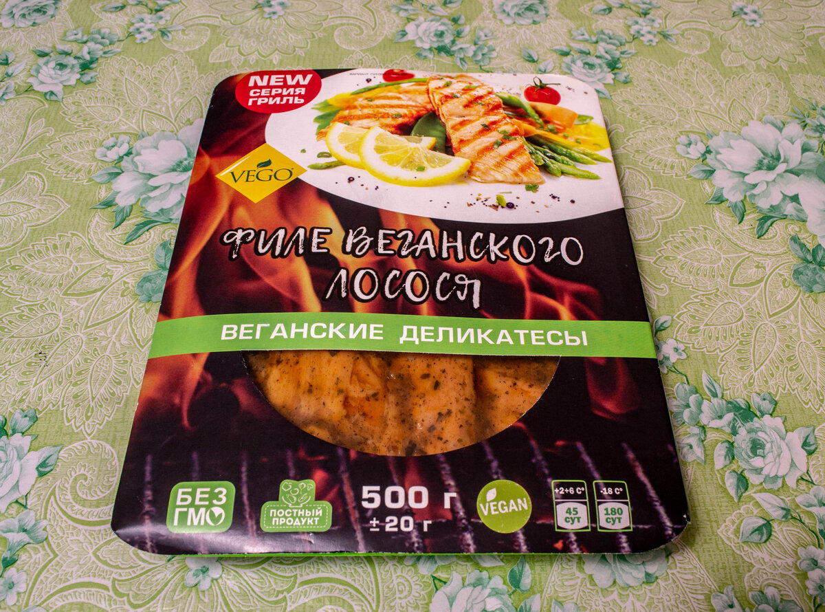 Недавно я прогуливался по гипермаркету «Глобус» и в отделе здорового питания наткнулся на продукт, упаковка которого буквально заставила меня взять его с собой. Встречайте, веганский лосось! Полкило веганского лосося мне обошлось в 300 рублей, что примерно в 2 раза дешевле настоящего лосося, хотя обычно с веганскими альтернативами бывает всё с точностью до наоборот. Давайте посмотрим, из чего он состоит: Состав: сейтан (овсяное молоко (вода очищенная, овсяная мука), пшеничный белок), масло подсолнечное рафинированное, соевые бобы (не ГМО), веганский аромат «лосося» растительного происхождения, натуральный краситель «паприка», морские водоросли «Нори», соль морская, сок лимона, специи (укроп, паприка сладкая, перец черный, перец душистый, любисток, базилик, лавровый лист, тимьян). Состав на удивление натуральный. Некоторые сомнения может вызвать разве что веганский аромат «лосося» (что бы это ни было). Сам продукт запакован в вакуумный пакет, в котором помимо «филе лосося» можно увидет