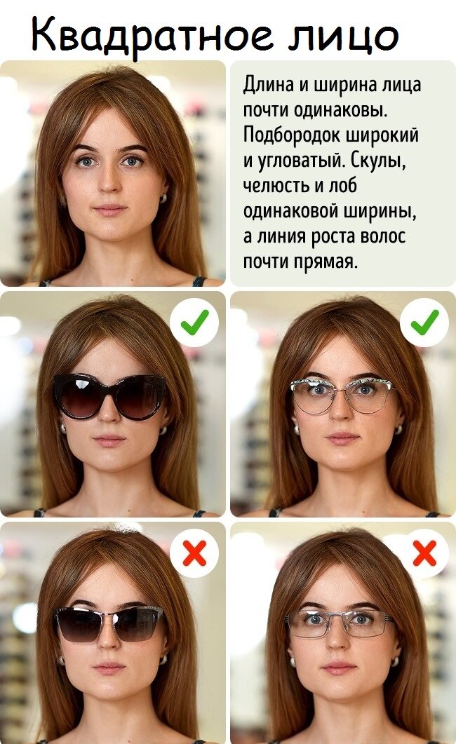 Хотите выбрать очки, но не знаете, как это сделать правильно? А просто идти в магазин, чтобы померить 100+ вариантов – это не ваш метод? Тогда давайте же скорее, не мешкая, выберем очки именно для вас. Начнём с типа лица: у вас какой? 1. Квадратный. Как у Анжелины Джоли или Дженнифер Анистон: волевой подбородок, чёткие линии. Характеризует сильную женщину по природе, а не в силу обстоятельств. 2. Круглый. Кирстен Данст, Хайден Панетьери, Мила Кунис: милый феминистичный образ, который всплывает в мозгу при слове «классическая красотка». 3. Треугольный. Рианна, Скарлетт Йохансон, Бейонси: остро выраженный подбородок (но не такой, конечно же, как у Квентина Тарантино). 4. Овальный. Шарлиз Терон: максимальная женственность, красота вне всяких «но». Челюсти более узкие, чем лоб. Скруглённый подбородок, выделенные скулы. Как подбирать 1. Квадрат. Такое лицо нельзя ещё больше «оквадрачивать». Выбирайте каплевидные или круглые очки, которые даже смело могут закрыть пол лица. Пусть ширина о