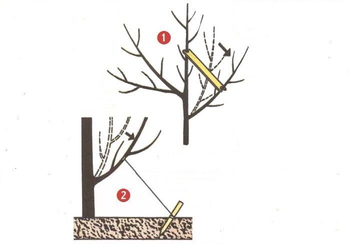 Существует несколько приемов, позволяющих сократить сроки ожидания первого урожая. Не плодоносит шестилетняя привитая яблоня. Посоветуйте, как поторопить «лентяйку». А. Грушевицкая, г. Москва Один из способов – изменение наклона ветвей дерева.Наклон сильных ветвей почти до горизонтального положения превращает их в полускелетные. Ветви наклоняют, используя распорки ( рис. 1) , или подвязывают их к лидеру, штамбу или кольям, вбитым в почву ( рис. 2) Другой прием, приближающий плодоношение, – сгибание ветвей. Ветви деформируют у основания или дополнительно в одной-двух точках (лучше – на границах годичных приростов). Удобнее всего приступать к данной работе в июне-июле, когда ростовые процессы заканчиваются и ветви становятся максимально эластичными. Перетяжка стволов или ветвей в начале вегетации – еще один способ «заставить» плодовое дерево цвести. Перетяжку выполняют с помощью проволоки, под которую подкладывают дощечки. В конце вегетационного периода, после того, как становится хор