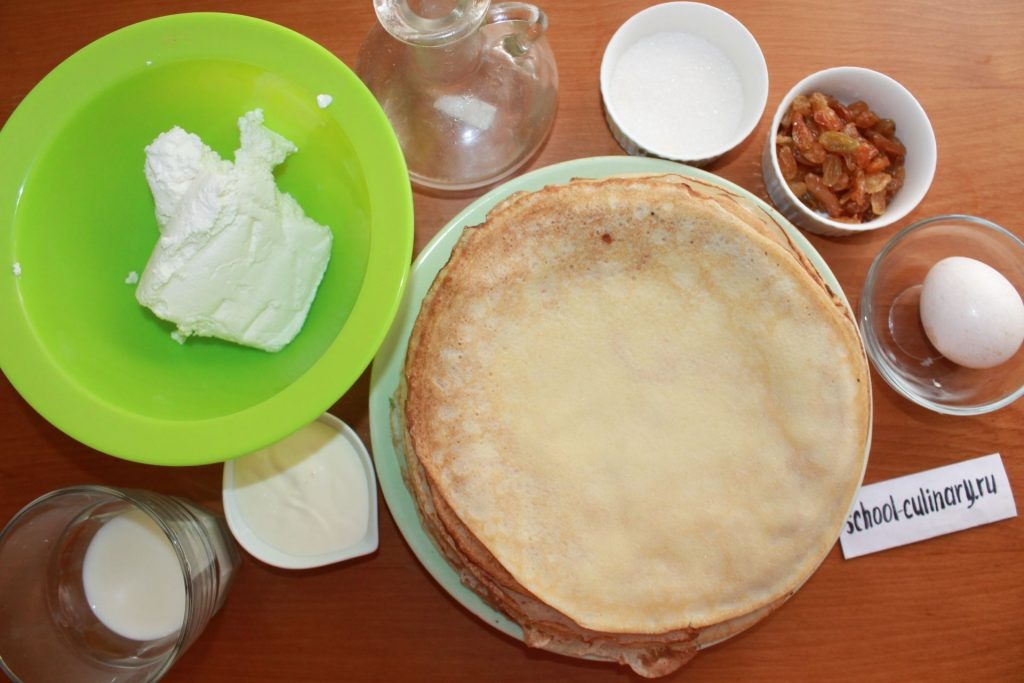 Готовим очень нежные и ароматные блины с творогом в духовке. Начинка с добавлением изюма получается яркой и вкусной. Блинчики складываются в жаропрочную форму и заливаются смесью яиц с молоком. В таком соусе они тушатся и выходит на редкость аппетитное блюдо с большим запасом нежности. Блинчики просто тают во рту. Дети и взрослые просят добавку уже после первого кусочка. А готовится такое кушанье очень просто. Ингредиенты: Приготовление Блины берем тонкие, приготовленные по проверенному рецепту. Хорошо, если они будут без дырочек. Так начинка не будет выглядывать. Изюм выбираем желтый. Он без косточек и более сладкий. Но выбор определяется исключительно предпочтениями хозяйки. Перебираем его и моем. Просушиваем. Творог кладем в удобную для перемешивания начинки емкость. Добавляем сахарный песок. Вливаем сметану и всыпаем просушенный изюм. Для более яркого аромата можно добавить ванилин. Все хорошо перемешиваем. На разделочную доску кладем блинчик. Выкладываем начинку и распределяем е