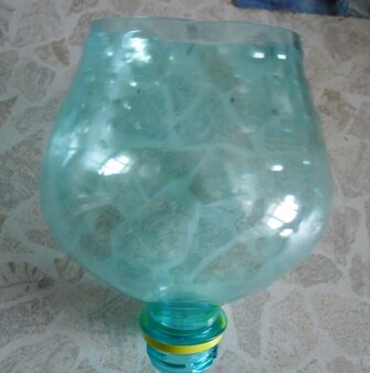 После изготовления «Люстры из пластиковой бутылки» у меня остались горлышко и дно. Я предлагаю сделать вазочку для салфеток или мелочей. Подобный МК я уже предлагала вашему вниманию. Эта вазочка будет проще в исполнении. 1. Форма горлышка и цвет мне напомнили колокольчик. Я решила его сделать. Верхний край горлышка визуально делим на 6 частей. Кому сложно визуально, можно воспользоваться сантиметром. Перманентным маркером ставим метки. 2. Ниже на 2 – 2,5 см ставим еще метки маркером, но посередине между верхними метками. 3. Ножницами делаем прорезь от верхних к нижним меткам. Вырезаются треугольники. Они нам не нужны. 4. В итоге получается колокольчик. 5. Метки стираем ватным диском со спиртосодержащей жидкостью. Остается чистое горлышко. Но само по себе оно не устойчивое, поэтому нужно сделать устойчивую ножку. 6. Откручиваем от горлышка пробку. Горячей спицей для вязания носков делаем в середине отверстие такое, что бы прошла в него ножка болтика. 7. Аналогичное отверстие делаем в