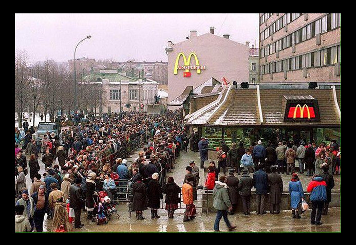о вкусах не спорят, но все таки Я помню Макдональдс еще таким. И тоже отстоял часа два в очереди, когда открылся первый в Москве на Тверской: Не помню, сколько стоил бигмак, но вместе с картошкой и колой получалось рублей пять. Зарплата инженера тогда была 130-160, хотя работы у инженеров уже почти не было и все шли чем-нибудь торговать. Выбор блюд в макдаке был раз в пять меньше, чем сейчас. Но я бы не сказал, что это плохо - ну или просто мы так привыкли. Но самое главное: в те времена не было этих кошмарных завтраков, которые ввели по утрам несколько лет назад и которые я есть не могу. Я про вот это: Мне так никто и не смог объяснить, почему привычные чизбургеры и бигмак с говяжьей котлетой по утрам получить нельзя. И вместо них есть только что-то с другими булками и кошмарной свининой внутри. Точнее, со свиной котлетой, в состав которой входит еще не пойми что плюс перец. Вот самый кошмарный бургер из всех, что я когда-либо ел: Острый, противный и переваривать это очень сомни