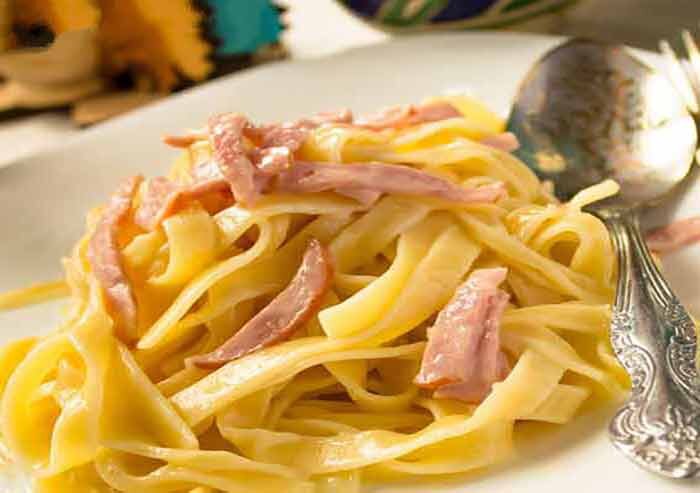 Это излюбленное в США, итальяно-американское блюдо. Получается очень пикантно и, что немаловажно, очень сытно. Внимание, важный момент! Вначале готовим соус, а пасту после. Для соуса нам понадобится: · свежие шампиньоны — 300 граммов; · лук репчатый — одна большая головка; · ветчина варёно-копчёная — 150 граммов; · сметана нежирная — 3 столовые ложки; · сливочное масло — 50 граммов; · соль — ее берем по вкусу. Способ приготовления: 1. Прежде всего, мы мелко режем луковицу, а затем нарезаем средними кубиками ветчину и грибы. 2. На большой сковороде разогреваем наше сливочное масло и обжариваем резаный лук до полупрозрачности, после чего засыпаем грибы и соль (самую малость), жарим всё под крышкой до полного испарения жидкости. 3. После этого туда же кладём ветчину, постоянно помешивая, обжариваем в течение нескольких минут, добавляем сметану, опять же помешивая, и тушим под крышкой ещё 3 минуты. 4. Теперь переходим непосредственно к приготовлению заливки сливочной и самой пасты. Бер