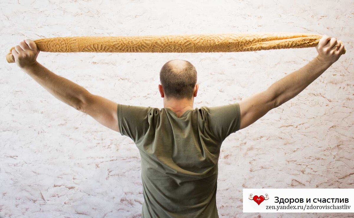 С возрастом мы все должны следить за нашим здоровьем Да, согласен, что за здоровьем Нужно следить с самого детства. Но, к сожалению, с годами наш организм нуждается в дополнительном уходе за собой. Я уже не один раз говорил о том, как важно выполнять физические упражнения в любом возрасте. Это касается как мужчин так и женщин. Когда я хожу в парк для тренировок, я наблюдаю совсем обратную картину. В нашем небольшом городке чуть меньше 10000 жителей , а в парке я вижу всего лишь 3-4 человека. На самом деле, это очень печально, но, что тут поделаешь - каждый сам поступает так, как знает. Сегодня хочу поделиться с вами великолепным упражнением, которое подойдёт абсолютно всем. Несмотря на то, что оно кажется простым, уверяю вас в том, что это упражнение принесет огромную пользу вашему организму. Для выполнения понадобится только полотенце и Ваше желание. Сверните полотенце в "колбаску". Возьмите за него руками на расстоянии немного шире, чем ширина ваших плеч и поднимите над головой.