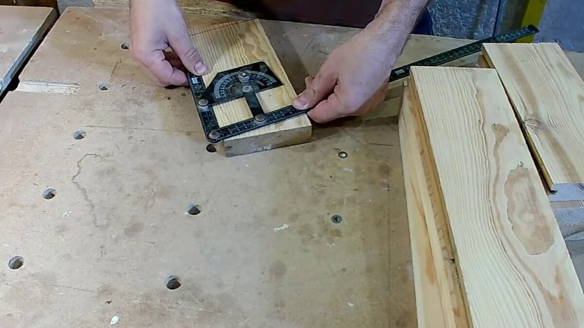 Конструкция которую хочу вам предложить опробована мной в разных вариантах - маленькая скамейка, лавка для бани, длинная лавка к столу. Скамейку можно сделать быстро. Если есть подходящие доски или для маленькой скамейки - обрезки досок, тогда достаточно получаса для изготовления. Понадобиться 4 одинаковых детали на ножки. И три одинаковых детали на царгу и сиденье. Начинается все с разметки ножек. Для небольшой скамейки доски на ножки можно сделать длиной 200-250 мм. Для лавки - 450 мм. Для сиденья и царги длину деталей выбирайте на свое усмотрение, если для одного человека размер может быть 300 мм. Если это лавка для нескольких людей, тогда рассчитывайте не менее 500 мм на одно место. Размечаем на ножках с двух сторон угол примерно 10 градусов. Далее к линии разметки с одной стороны прикладываем угольник и отмечаем еще одну линию так, чтобы она выходила на край доски. Теперь отпиливаем размеченные углы. Отпилить можно чем угодно, ножовкой, лобзиком или как это делал я, на циркуляр
