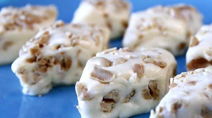 Продукты: Заходите на мой сайт и читайте ещё больше новых рецептов Как приготовить: В кастрюлю выложить кусочки сливочного масла, добавить сахарную пудру и поставить на плиту. Разогреть на среднем огне до тех пор, пока сахарная пудра не растает. Затем добавить сметану, интенсивно перемешивать, чтобы не было комочков. Затем снять с огня и остудить содержимое до комнатной температуры. В остывшую массу добавить небольшими порциями сухое молоко, каждый раз перемешивать миксером. Взбивать до густого однородного состояния. Очищенный арахис обжарить на сухой сковороде или в духовке в течение 10 минут, остудить и добавить в тесто. Совет. Очень вкусно получится, если добавить соленый арахиса в сладкое тесто. Форму смазать сливочным масло и выложить наше тесто, накрыть ее пищевой пленкой и убрать в холодильник минимум на 3-4 часа. После этого, вынуть десерт из формы. Сверху сладость посыпать арахисом, вдавливая его руками. Нарезать на ромбики и подавать на стол. ПРИЯТНОГО АППЕТИТА!
