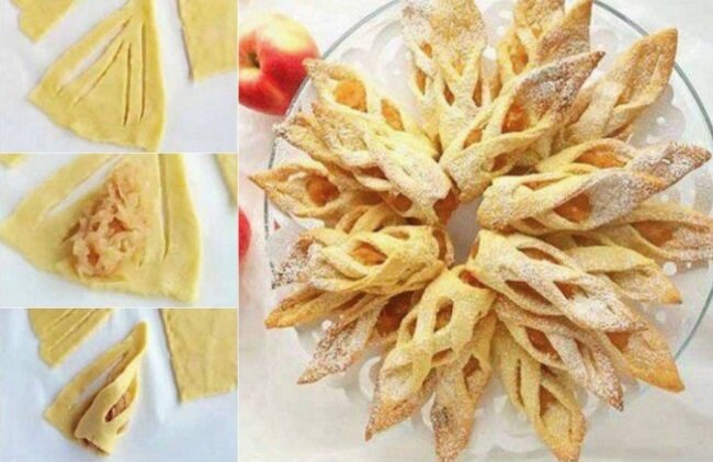 Ажурные печеньки Раскатать тесто в пласт, нарезать как показано на фото. Выложить яблоки, смешанные с небольшим количеством лимонного сока, завернуть. Печенье «Пуговка» С помощью крышки от бутылки и трубочки можно приготовить хрустящие пуговки. Заходите на мой сайт и читайте ещё больше новых рецептов и советов Зайчики для детей Скатать шарики из теста и сформировать с помощью ножниц заячьи ушки. Спичкой сделать глазки. Цветы из слоеного теста Сделать кружочки из слоеного теста. В центр положить сухофрукты, защипнуть края и разрезать, как на фото. Готовить изделия во фритюре. Сверху полить джемом или сиропом. Пирог из роз Раскатать тесто, вырезать формочками или стаканом круги. Соединить 3 круга, свернуть в рулет и дальше проделать то, что показано на фото. Рулеты из яблок или овощей Взять специальный нож для чистки овощей, порезать на полоски и сформировать из них розы и выложить в основу для пирога. Тот самый пирог «Зебра» Один из популярнейших тортов прошлого века. В миске пр
