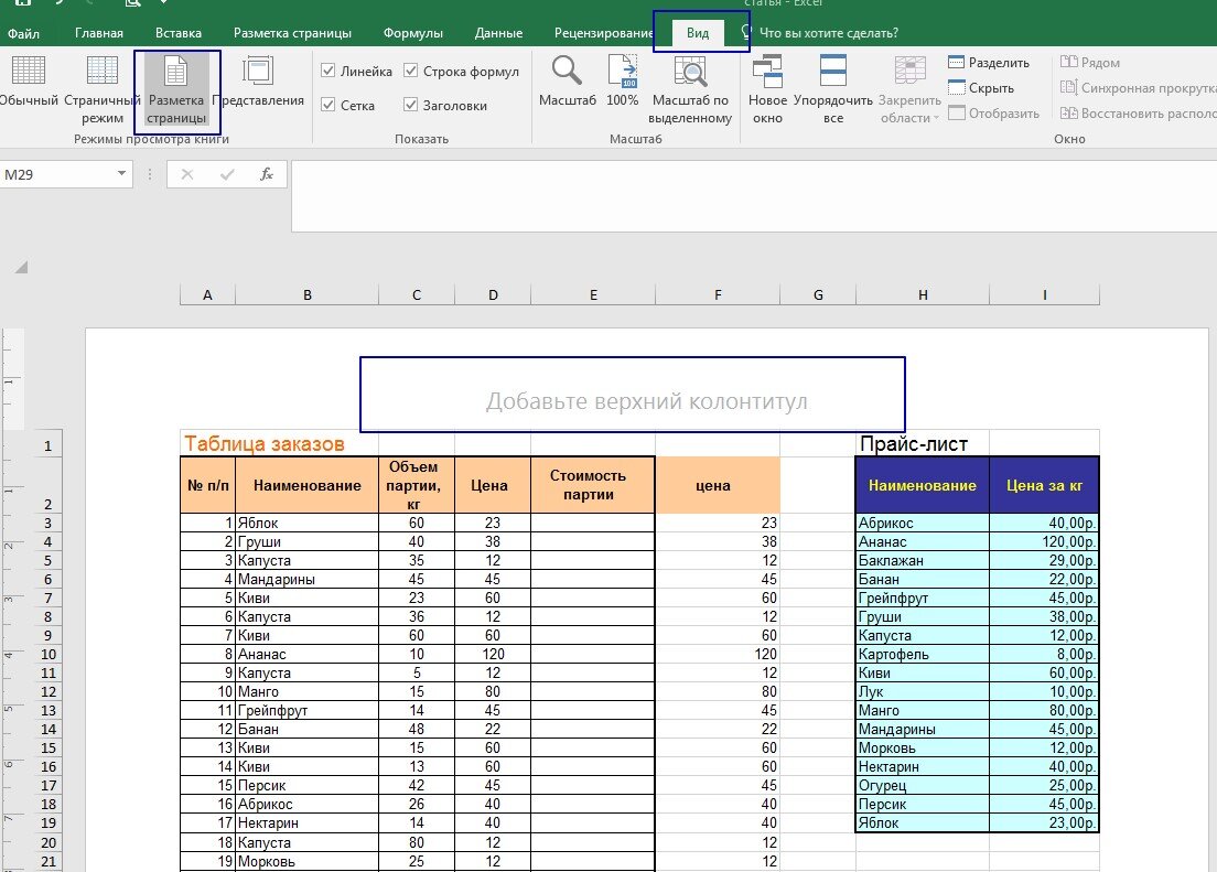 Что бы увидеть колонтитулы перейдите во вкладку «Вид» и нажмите кнопку «Разметка страницы». Программа предлагает добавить верхний колонтиткул, но нам нужен нижний, для этого прокрутите страницу вниз и добавьте в поле «Нижний колонтитул» нужную информацию. Стандартную информацию можно выбрать на вкладке «Конструктор» кнопка «Нижний колонтитул» Или если мы хотим выбрать текущую дату и время нужно нажать кнопку на вкладке «Конструктор» «Текущая дата» далее пробел и кнопку. Вот что получилось: Что бы выйти из режима колонтитулов и посмотреть как выглядит документ на печати, нужно: 1. Нажать на вкладке «Вид» кнопку «Обычный режим». 2. Вызвать окно просмотра через вкладку «Файл» - «Печать» или сочетанием клавиш Ctrl + F2 Обратите внимание на курс "Microsoft Excel 2016/2019. Уровень 1. Базовый". Понравилась статья? Поставьте лайк и поделитесь ей в соцсетях ► ►