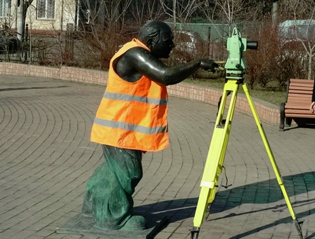 Геодезистом можно стать, но лучше всего им родиться, это особый стиль жизни, образ мышления и вообще у геодезистов не всё как у обычных людей. Конечно внешне отличить геодезиста от негеодезиста вне работы очень сложно, но можно. Например, прогуливаясь по бетонному пирсу на отдыхе ногой наткнулся на дюбель, забитый в бетон и обведённый краской (несомненно геодезистом), для привязки. Сразу же мысль возникла- надо подснять. Вот это «надо подснять» особая фраза в геодезии, это и юмор, и правда жизни и особая магическая фраза, кто знает – тот поймёт. Когда идёшь по улице и вдруг взглядом наткнёшься на репер где-нибудь на столбе или на бетонной колонне или ещё где-то если ты геодезист- просто так равнодушно уже не пройти мимо, хоть одним взглядом, но посмотришь, что за репер? И везде приследущая мысль «подснять»! Та же история с маленькими крестиками «опорными точками» и конечно «марками» особыми отражательными плёнками для работы прибором. Эти точки и «марки» везде, если всматриваться и замечать - они могут быть где угодно: в метро, переходах, на столбах и зданиях, на дорожных знаках и заборах, их можно заметить везде - даже на деревьях(но очень редко). Люди ходят по сто раз на дню мимо них и даже не замечают, а возможно чей-то геодезический глаз сейчас смотрит в окуляр наводясь на точку а люди по незнанию закрывают их обзор как будто специально. Сколько таких случаев было: стоишь, смотришь в окуляр как мужик стоит и курит перегораживая весь обзор и ты упорно ждёшь того момента когда он хоть на миг наклонится или отойдёт или ещё что произойдёт чтобы ухватить момент и «подснять» эту злополучную точку. И как на зло мужик не торопится, долго прикуривает, глядит по сторонам, дымит и никак не хочет отойти в сторонку хоть на миг, к нему подходит прохожий, стреляет сигарету, вот они склоняют головы чтобы подкурить, ты в надежде ждёшь что откроется хоть малюсенькое «окошечко» чтобы «стрельнуть» прибором, но нет, как на зло они стали скалой на твоём пути и не хотят сдвигаться ни на сантиметр. Ты в душе проклинаешь и этих незнакомых людей, что перекрыли видимость и твоего помощника что наклеил «марку» именно на этом углу остановки, хотя ты хотел и повыше и вообще на столбе, а столб этот как нарочно сейчас виден со всех сторон и никто тебе не мешал бы сейчас будь эта злополучная точка на этом долбаном столбе. И себя проклинаешь что не стал чуть правее на полметра, с того места уже давно бы всё «подснял» и забыл, но переставляться уже не вариант. Но проходит время и мужики начинают движение, ты всматриваешься в прибор и наконец, наконец есть «окошко», ты уже видишь в перекрестие цель, быстро наводишься на «марку», ещё буквально секунда чтобы поправить винтом точность наведения… и … и тут прямо у остановки встаёт грузовик, перегораживает всё наглухо. Всё приехали! Кино закончилось! Грузовик стоит и мигает аварийкой, сколько он здесь простоит? чёрт его знает, две минуты или 3 часа, кто знает? В душе ты уже выругался трёхэтажным отборным, кричать, орать, свистеть, махать бесполезно, никто тебя не видит и не слышит, вообще никто не подозревает что ты здесь стоишь и ждёшь когда же они все свалят с горизонта. Даже помощника нет, он ушёл за пирожками для перекуса и его не дозовёшься, чтобы сходить разогнать курильщиков, попробовать попросить грузовик отъехать или ещё что-н