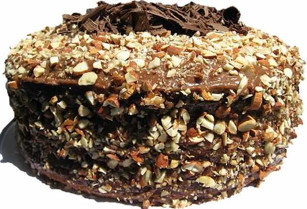Далее, на плоское блюдо укладываем пергаментную бумагу. Каждое печенье обмакиваем в оставшемся кофе и выкладываем на бумагу слоями, намазывая каждый слой кремом (получается примерно 3-4 слоя). Верх торта покрываем кремом и обсыпаем орехами.