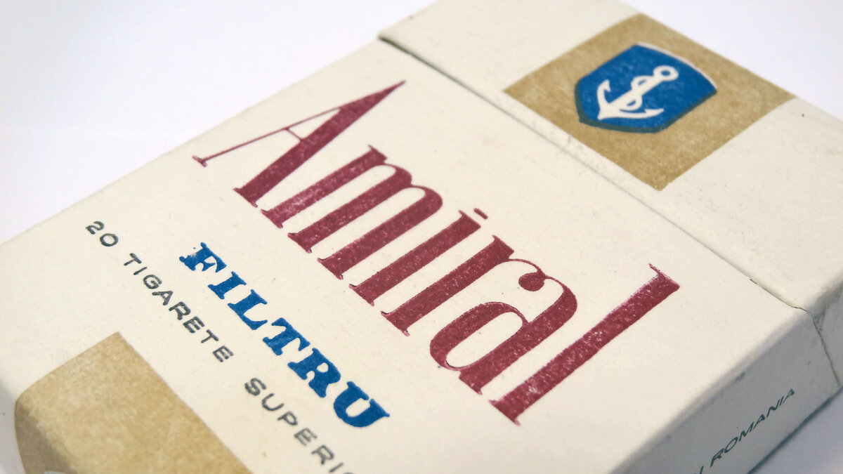 Эти сигареты выпускались с 1970-х по 1990-е румынской табачной фабрикой Intreprinderea de Tigarete Bucurest, известной на табачном рынке с начала 20 века. Фабрика существует и по сей день, но уже под крылом корпорации JTI. "Amiral" выпускался в двух вариантах упаковки - в мягкой пачке и картонном flip bpx'е. Чаще всего эти сигареты встречались в стандартном формате на 78 мм, но бывали и в long 100's хотя и реже. С определением происхождения названия бренда проблем не возникло - Amiral, в переводе с румынского, означает "адмирал". Названием объясняется часть оформления пачки. Итак, в моем распоряжении, благодаря коллекционеру Чернышеву Иннокентию Павловичу, оказалась пачка этих сигарет. Пачка из жёсткого, не глянцевого картона. Оформление скромно, но многоцветно - белый фон, золотистая лента по центру пересекает всю пачку, крышка пачки и её торцы несут синий щит с белым якорем, а центральную композицию занимает имя бренда в тёмно-красном цвете. В пачке двадцать сигарет с обычным ацетатн