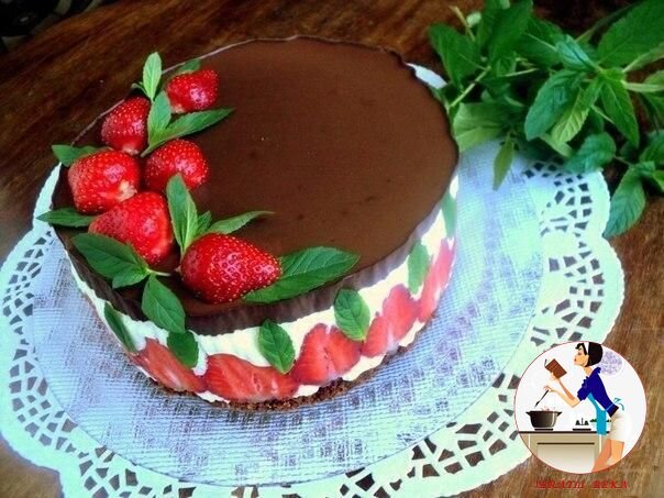 Shirinlikni sevib iste'mol qiluvchilar uchun ushbu tort e'tibordan chetda qolmasligi aniq. Tayyorlangan tort har qanday dasturxondan o'zining yorqin o'rnini egallab, dasturxon davrasida barchaga hushkayfiyat ulashadi. Kerakli masalliqlar: Biskvit uchun: 1 dona tuxum 50 gramm shakar 1 osh qoshiq kakao kukuni 1/2 choy qoshiq qabartma 2/3 stakan un Sufle uchun: 250 gramm smetana 200 ml yogurt 2/3 stakan shakar 15 gramm jelatin 1 upakovka kivili jele 500 gramm qulupnay Ganash uchun: 100 gramm shokolad 100 ml qaymoq Tayyorlash usuli: 1. Birinchin navbatda jeleni tayyorlang. Qog'ozida ko'rsatilgan ko'rsatma bo'yicha. Faqat suvni ko'rsatilgan qismini yarmini quying. Idishga solib sovuting. 2. Bu vaqt mobaynida biskvitni tayyorlang. Buning uchun: tuxum va shakarni ko'pirtiring. Kastryulkaga issiq suv quying, tuxumli massani kastryulka ustiga qo'yib, hajmi 3 marotaba ko'paygunga qadar ko'pirtiring (bu jarayonni shunchaki issiq suv ustida bajaring, aslo olovga qo'ya ko'rmang, taxminan 5-6 daqi