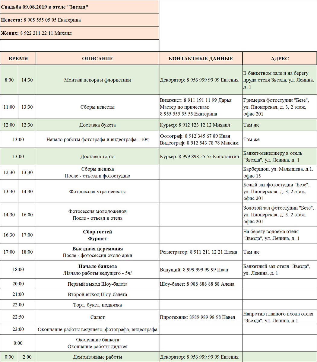 Для чего нужен тайминг план ? У всех мероприятий есть программа по которой они идут. Если ее не будет – случится хаос. В организации свадьбы так же. Как часто бывало, что ты приехала к подруге на свадьбу, вот сборы невесты, приехал жених, а дальше ? «Мы думали, погуляем, а куда и сколько по времени даже не думали»… Поэтому в самом начале нам нужно определить структуру дня, некий скелет, позже нарастить на него интересное и запоминающиеся детали. Этот скелет называется тайминг дня и для удобства можно сделать два: на день и банкет. В них нужно вписать все, что планируете в этот день: подъем, завтрак, макияж, прибытие фотографа, выезд на прогулку, аренда студии, регистрация, прибытие в банкетный зал – для тайминга дня и прибытие ведущего, встреча гостей, поздравление родителей, подача блюд, выступление кавер-группы, трансляция Love story, салют на улице – для банкета. При составлении документа нужно быть реалистом. Что это значит? Нужно понимать, что если ты пишешь начало в 18.00, это не