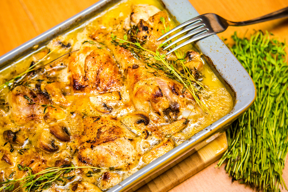 Курица…вернее, куриная ножка. Что может быть вдохновительнее? Разве что куриная ножка умащенная вкусным соусом, запеченная в солярии…тьфу, в духовке до нежной консистенции с легкой румяной корочкой, приправлена травками всевозможными заморскими аль родными… Если вы вдохновляетесь ножками (куриными и не только) так же как и я — велкам, велкам дорогие мои гурманы (и не очень гурманы). Сегодня будем готовить курочку, в сливочно-горчичном соусе, да с грибами. У вас уже потекли слюнки? И правильно! Грибы и курица — одно из тех беспроигрышных, классически идеальных сочетаний, гарантирующих успех любому блюду без исключения. Если у человека, оккупировавшего кухню, есть руки, даже если растут оттуда, что и ноги, испортить курочку с грибами ему будет очень сложно. Разве что сжечь…или пересолить… Открою страшный секрет — пару раз у меня нечто подобное было. Благо, не вошло в традицию. Ну, да ладно, хватит лирики, приступаем к физике. Кухонной. Кухонная физика нам говорит, что выкладывать ку