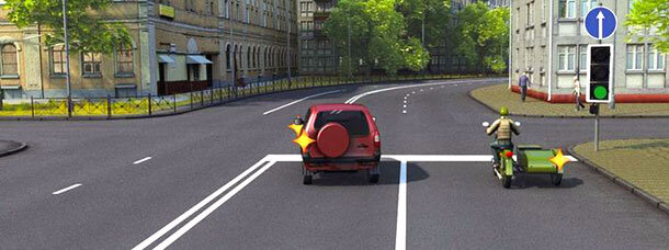 Здравствуйте дорогие читатели! Сегодня с Вами разберем еще один вопрос из экзаменационного билета. Вопрос простой, но вызывает затруднение. И мы сегодня его разберем. Вопрос в билете звучит примерно вот так: Кто из водителей нарушает? И вопрос имеет вот такие варианты ответов: 1. Оба. 2. Только водитель легкового автомобиля. 3. Только водитель мотоцикла. 4. Никто не нарушает. Уже знаете правильный ответ? Не торопитесь, дочитайте статью до конца и убедитесь в нем. Перед нами перекресток, и оба водителя хотят совершить поворот. Как мы видим зеленый сигнал светофора разрешает им движение. Но перед светофором установлен знак, который обозначает "Движение прямо". Как мы знаем этот знак указывает в каком направление мы должны двигаться. Так как знак установлен до перекрестка, значит он действует только на первое пересечение. Следовательно, перекресток мы можем проехать только в прямом направление. Приходим к выводу, что правильный ответ на наш вопрос: 2. Оба Наша команда надеется, что