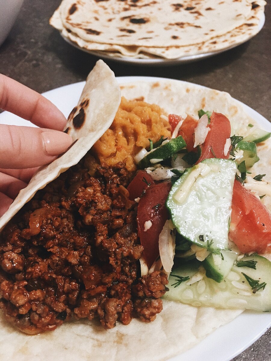 ⬇️🔥открытая шаурма🔥⬇️ У нас она сегодня выглядит именно так, потому что мы стараемся кушать правильно 😂 Для лаваша: 170мл☘️горячий кипяток 270гр☘️мука 1ст.л☘️оливковое масло ☘️Щепотка соли и щепотка паприки Для начинки (у каждого на свой вкус) 300гр☘️говяжий фарш 2ст.л☘️томатная паста 1/2шт☘️луковица 1/2ч.л☘️сухая аджика 1 зубчик☘️чеснок 3шт☘️помидорка 1/2☘️луковица 2шт☘️огурец 100гр☘️тертый сыр ☘️Зелень, чёрный перец, щепотка соли , лимонный сок ☘️кабачковая икра -Все ингредиенты для лаваша замешиваем и оставляем под пищевой плёнкой на 30 минут -Тем временем обжариваем 1/2 луковицы до прозрачности, добавляем фарш и тушим до полуготовности -Выдавливаем чеснок, добавляем томатную пасту, 1/2 стакана воды, специи и тушим до готовности -Нарезаем салат из оставшихся ингредиентов -Тесто делим на 6 шариков и раскатываем -На раскалённой сковороде без масла обжариваем по 2 минуты с каждой стороны ( когда лаваш начинает пузыриться, переворачиваем) -горячие лепёшки кладём друг на друга, сб