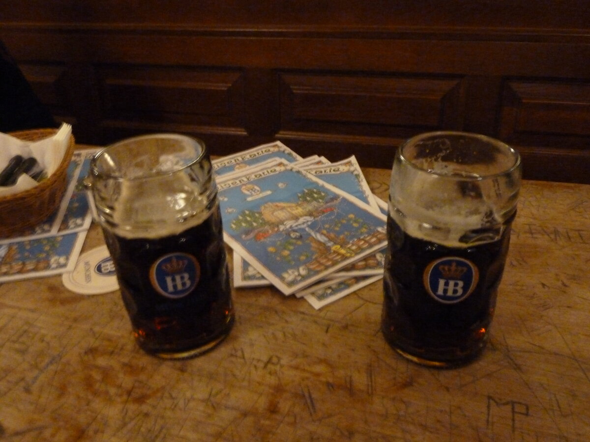 Обязательный пункт экскурсионной программы в Мюнхене -- посещение знаменитой пивной "Хофбройхаус", которая находится недалеко от ратуши. Историю этот кабак ведёт аж с 1516 года, так что кто только там не пьянствовал... Среди завсегдатаев, интересных российскому туристу, особняком стоят товарищ Ленин с Надеждой Константиновной. Говорят, на заре туманной юности эта парочка очень уважала "Хофбройхаус". И даже революционно хохмила, что аббревиатуру этого названия (НВ) на самом деле следует расшифровать как "Народная воля" (хотя я бы подумала, что "Надя и Володя"). Ну, что тут сказать -- пиво и партия едины, конечно, но тут их лучше разграничить. Начнём с главного: фирменное пиво из местной пивоварни здесь подают только кружками по 1 литру. Хоть тёмное, хоть светлое (кстати, вкусное и то, и другое). Стоит любимое удовольствие Ильича 9,20 евро. Попросить половинку нельзя. Для дам, конечно, литровая кружка пива -- вызов во всех смыслах. Во-первых, тяжело поднимать (ну неплохая такая гирька!)
