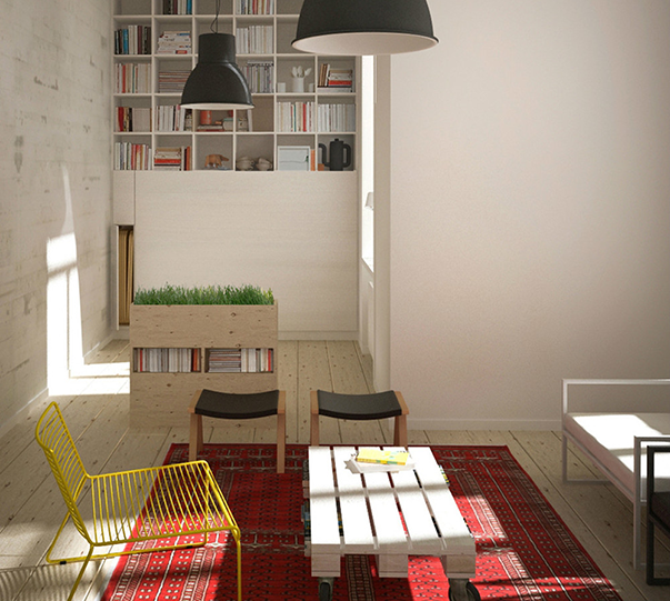 Кровать есть – а вот ее и нет! Спальня исчезает, а на этом месте появляется кабинет. Обратите внимание на складной стол, он же книжный стеллаж, он же ящик для растений – кстати, растения в этом проекте еще появятся, в самом неожиданном месте… Вокруг стола размещаются стулья, которые в нужный момент снова спрячутся под книжными полками.