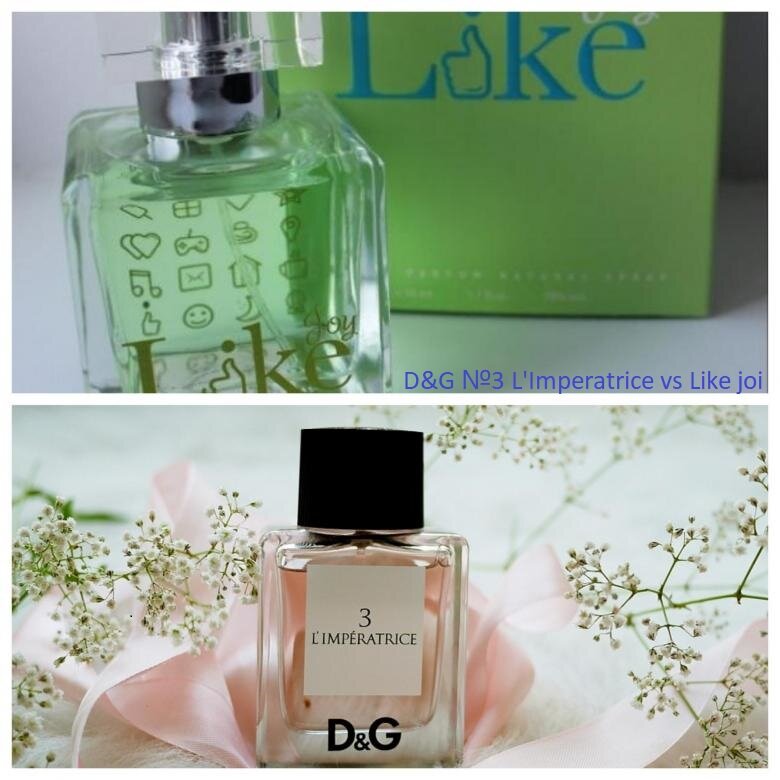Сегодня поговорим о том, как можно сэкономить на покупке любимых ароматов. Ни для кого не секрет, что цены на брендовые ароматы просто "кусаются" и не каждый может себе позволить купить такие духи. Сегодня будем искать аналог для туалетной воды D&G №3 L'Imperatrice, аромат которой так полюбился многим представительницам женского пола. Думаю этот легендарный аромат в представлении не нуждается, поэтому перейдем к его бюджетному конкуренту Like joi. Аромат. На 90 % повторяет аромат известного бренда, но чтоб это определить вам необходимо одновременно тестировать оба парфюма. В В обычной жизни вы никогда не заметите разницы. Хочу сказать, что парфюмерная вода изготавливается в России, но все ароматические вещества поставляются из Франции. Пирамида аромата Верхняя нота: цветущий розовый перец и ароматный киви.