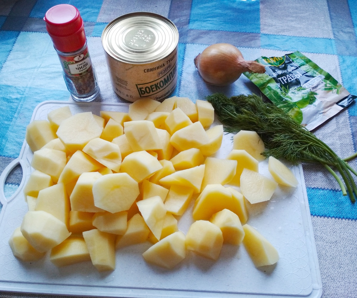 Это рецепт о том, как дешево и быстро накормить семью или просто самому не остаться голодным! Будем готовить обалденную картошку с обжаренной тушенкой в подливке! Есть парочка секретов:) Ууу, я уверена Вам понравится, поэтому не забудьте поставить лайк;) Тут главное купить вкусную тушенку и не мороженную картошку, а все остальное будет очень простым! Нам понадобится: 1. Банка тушенки - у меня была свиная марки "Боекомплект" купленная в Ленте. Брала первый раз, оказалась весьма приличной. 2. Картошка - 0,8-1,0 кг. 3. Лук - 1 шт. 4. Укроп - по желанию. 5. Специи - соль, смесь перцев. 1. Чистим и нарезаем картошку на средние кусочки разной форма. Начинаем варить. 2. Открываем тушенку и берем из банки немного жира (белого или желеобразного). Закидываем на разогретую сковородку. 3. Режим мелко лук и обжариваем его на жиру от тушенки. Лук сначала будет слегка тушиться, а потом уже обжариваться. Поэтому он получится нежны, вкусным и тающим. 4. Сначала, в самой банке ножом, измельчаем тушенку,