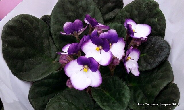 У нее форма треугольника, вершинами которого служат три старых листа. Выросло еще два ряда новых, из пазухи каждого - по цветоносу. Букетик получился плотнее того, с которым фиалка была куплена.