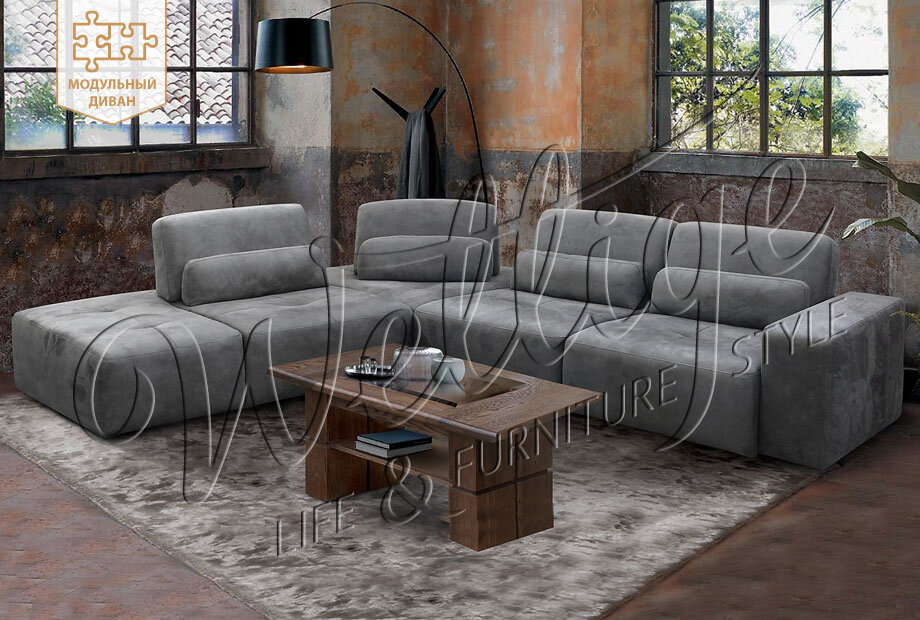 Модульный принцип позволяет собрать конструкцию дивана из необходимых покупателю деталей. Диваны получаются самых разных размеров, с левым и правым углом, П-образного типа, с оттоманками или с кресельной частью и т. д. Модули могут быть отдельными и самодостаточными элементами.