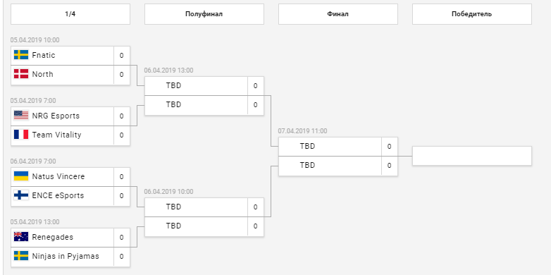 05.04.2019: -7:00 NRG Esports vs Team Vitality команды более-менее равные но должны выиграть NRG Esports. -10:00 Fnatic vs North явный фаворит Fnatic. -13:00 Renegades vs Ninjas in Pyjamas фаворита тут Renegades т.к. показали отличное выступление на IEM Katowice. 06.04.2019: -7:00 Natus Vincere vs ENCE eSports это будет самая интересная игра (для меня xD топим за нави) Natus Vincere должны вернуть должок за Major. -10:00 игра за выход в финал скорее всего Renegades vs Natus Vincere фавориты Natus Vincere. -13:00 еще 1 матч за выход в финал Fnatic vs NRG Esports для меня фавориты тут NRG Esports. 07.04.2019: -11:00 финал Natus Vincere vs NRG Esports я считаю, что фавориты Natus Vincere. вот такое расписание матчей и вот такой мой прогноз) пишите комментарии кто как считает, буду рад почитать.