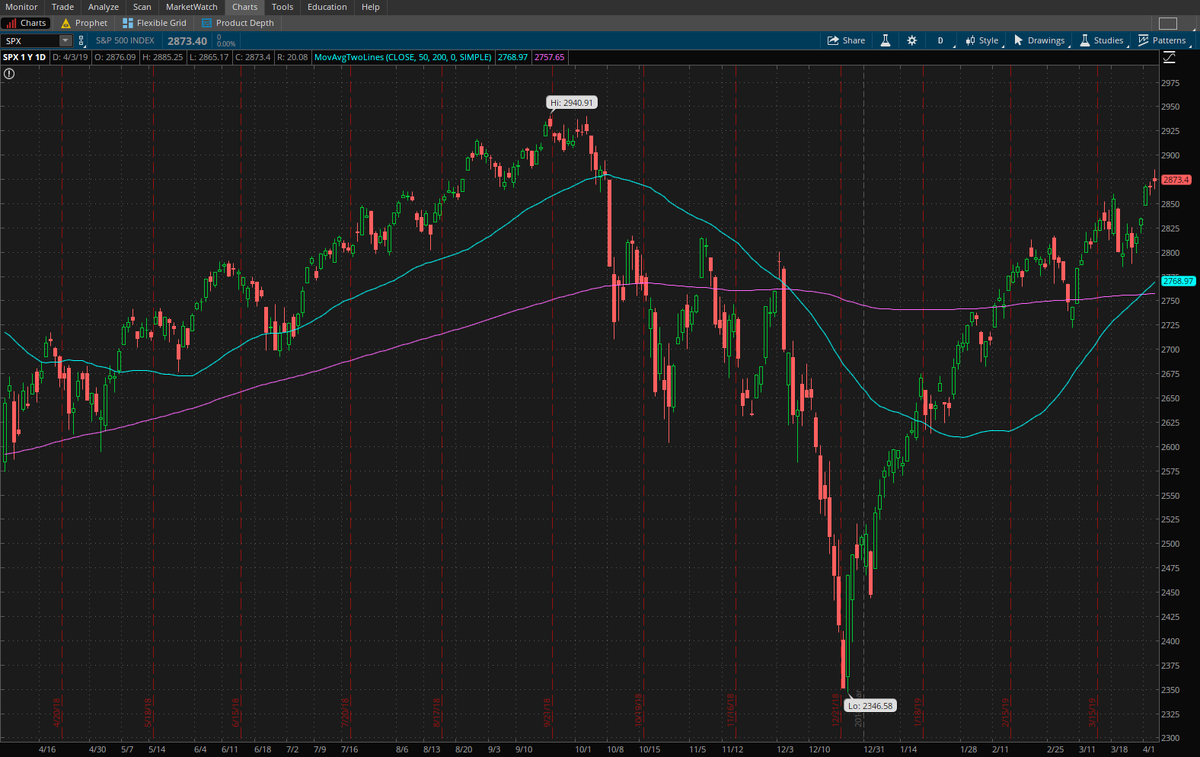 "Золотым крестом" любители классического теханализа называют момент пересечения 50-дневной и 200-дневной скользящей средней (50-MA и 200-MA), и когда 50-MA поднимается выше 200-MA, это является для них чётко выраженным сигналом бычьего рынка. Последний раз такое случилось в апреле 2016г, и после этого рынок вырос на 26% до обратного пересечения в декабре прошлого года с максимальной просадкой 4.5% на этом периоде. В этот понедельник мы снова увидели положительный "Золотой крест", и в этом посте постараемся понять: действительно ли это важный индикатор для рынка акций, и с какого момента истории фондового рынка он начал работать? Разберём всё по полочкам. Итак, прошлое отрицательное пересечение 50-MA и 200-MA произошло 07.12.2018, после чего рынок продолжил обваливаться, и этот декабрь стал худшим со времён Великой Депрессии. Уже 24.12.2018 $SPX нашёл дно, и сейчас мы уже в 3% от исторических максимумов. Мы видели отличное начало года, которое статистически даёт нам хороший шанс и на п