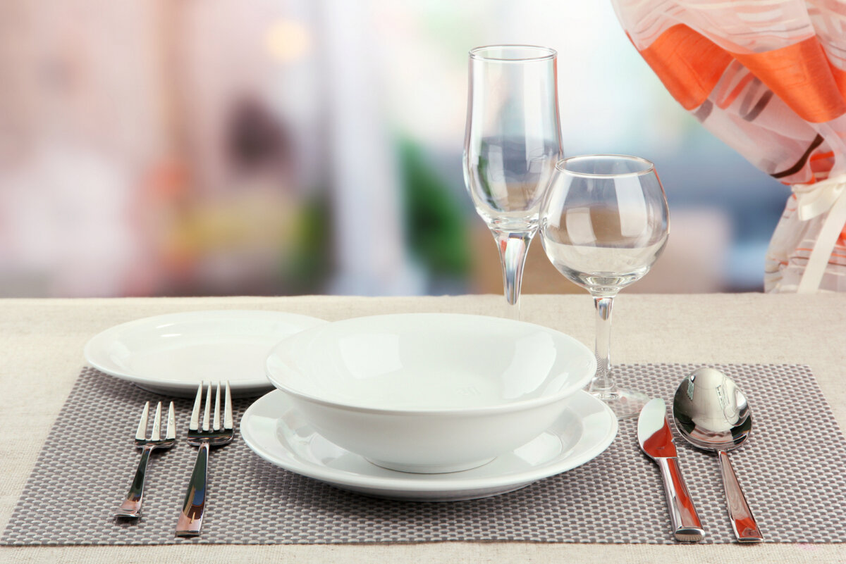 Сервировка стола в домашних условиях Секрет идеально оформленного стола прост: сервировка должна начинаться с выбора столового белья. Оно должно гармонировать с посудой, блюдами и интерьером помещения. Столовое белье – это специальные скатерти и салфетки, которые обязаны быть чистыми, выглаженными и, конечно, идеально постеленными. Только в таком случае стол получится по-настоящему торжественным и достойным наивысших похвал. Столовое белье. Скатерть на стол. При выборе подходящей скатерти учитывается размер стола. Концы скатерти должны спускаться со стола на 25-30см. Причем, на торцах длина получается еще больше. Для того чтобы скатерть легла идеально, ее нужно взять по ширине обеими руками, встряхнуть и опустить на стол. Далее сдвигайте ее в нужную сторону до тех пор, пока складки не окажутся ровно в центре стола. Необходимо проверить углы скатерти – они должны быть точно напротив ножек стола. Современные скатерти бывают абсолютно разных цветом, но традиционно на торжественных мероп
