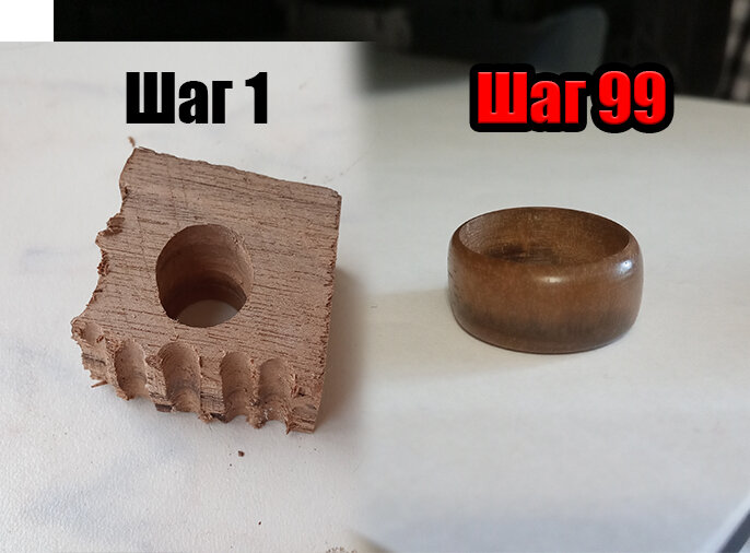 На этом канале я делюсь своим хэндмейдом, показываю что уже сделал. В этот раз я решил показать как делается кольцо из твердых пород дерева пошагово. На изготовление ушло 2 дня - мог бы уложиться и за один, но я поздно начал, поэтому пришлось выделить дополнительный день. Сначала я покажу результат, который удалось получить, затем пошагово расскажу, как к я к нему пришел. Было/Стало: Теперь я покажу, каким образом я дошел до шага 99. Сначала я взял кусочек обычного дерева. Я даже не помню, что это за порода, возможно падук. На картинке видно, что на вид оно неказистое. Для того, чтобы сточить лишнее я не использую лобзик или ножовку, так как быстрее и точнее это можно сделать с помощью наждачного круга, например такого, как на фотографии. Я пользуюсь кругом с липучкой - это очень удобно. Примерно минут 10-20 под разными углами нужно стачивать лишнее. Получается что-то подобное - все еще грубый кусок дерева: Во время стачивания становится заметно, что в одном месте кольцо значительно то