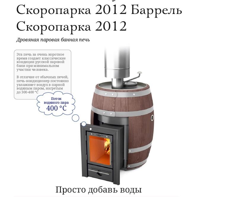 - Дровяная банная печь –паровая пушка, данный модельный ряд включает в себя серию «Скоропарка».