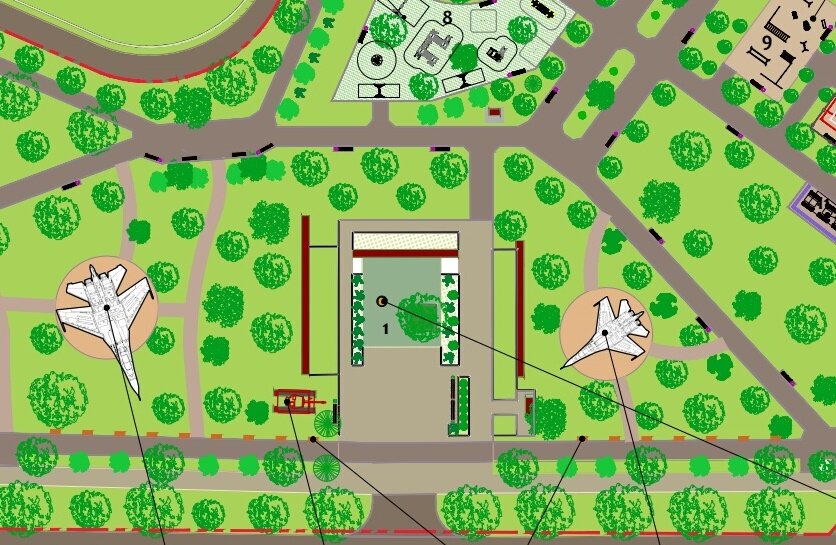 Об этом сегодня рассказал глава Крымского района Сергей Лесь на 65-ой внеочередной сессии Совета муниципалитета. В парке на улице Свердлова будет обустроен музей под открытым небом. На территории установят два военных самолета Су-27 и МиГ-29. Также здесь откроется «Аллея Героев» - с информацией о героях-земляках, отличившихся в период Великой Отечественной войны, Героях России и труда Кубани. Работы по установке новых объектов будут проводиться в этом году во время капитальной реконструкции парка по программе «Формирование комфортной городской среды». На фото – планируемое расположение новых объектов.