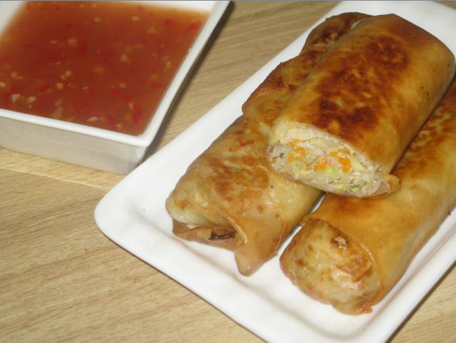 Спринг ролл (Spring roll) - блюдо из разнообразных начинок, завернутых в тесто spring roll. Относятся к восточно-азиатской, южно-азиатской и юго-восточной азиатской кухням. Тем не менее популярны в Европе и Америке. Техника приготовления в каждом регионе и каждой стране отличается друг от друга. У нас сегодня в меню жаренные вьетнамские спринг роллы. На 7 штук вам понадобится: 7 шт. квадратов теста для спринг роллов 25x25см 250 гр. куриного филе бедра 400 гр. капусты 1 стебель сельдерея чашки стебля сельдерея 0,5 шт. моркови 0,5 шт. белого лука 45 гр. сырой рисовой лапши 1/2 ч.л. черного перца 1 ч.л. соли растительное масло Начинаем готовить. Лук, сельдерей мелко нарезать. Лук обжарить на оливковом, добавить сельдерей и еще немного обжарить. Капусту тонко нарезать и залить кипятком на 5 минут, слить. Рисовую лапшу залить кипятком на 5 минут, слить, крупно нарезать. Куриное филе промолоть в блендере. Смешать овощи, рисовую лапшу, курицу, соль, перец. Заворачиваем в тесто. Распределить