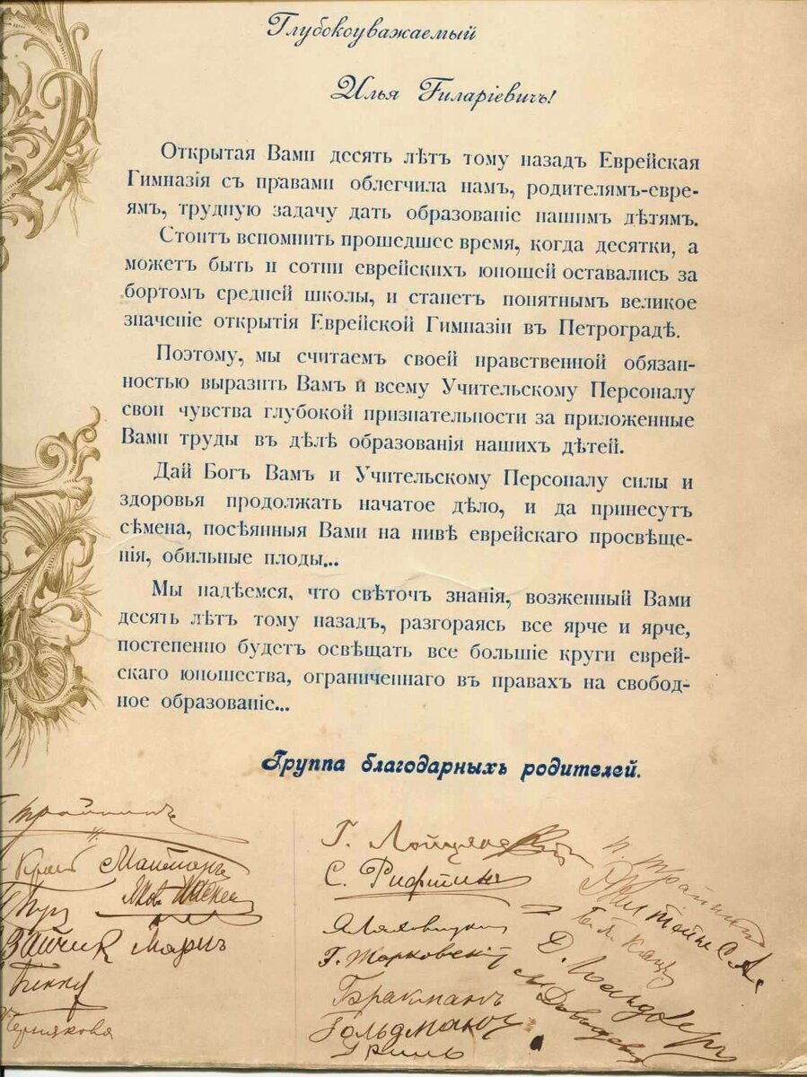 «...Мы считаем своей нравственной обязанностью выразить Вам и всему учительскому персоналу свои чувства глубокой признательности за приложенные Вами труды в деле образования наших детей.